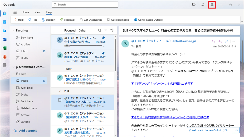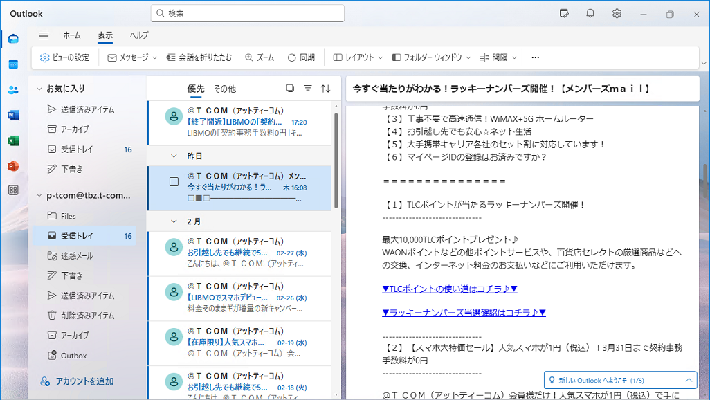 Outlook(NEW)の画面が日本語表記に変更されたことを確認します。