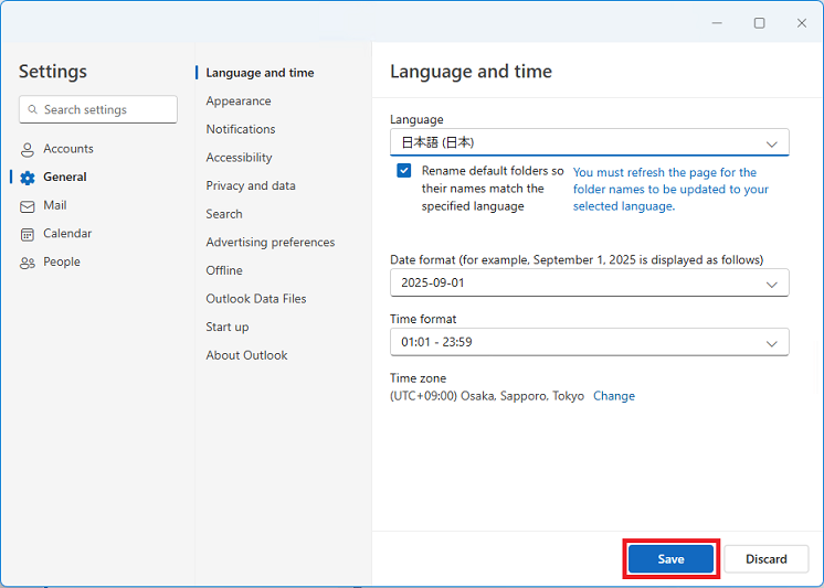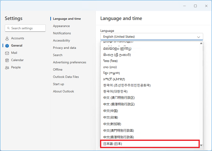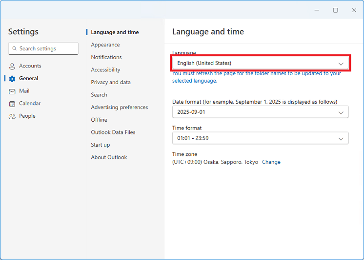 Windows/Outlook(NEW)の画面が日本語以外の場合はどのようにすれば良いですか?
