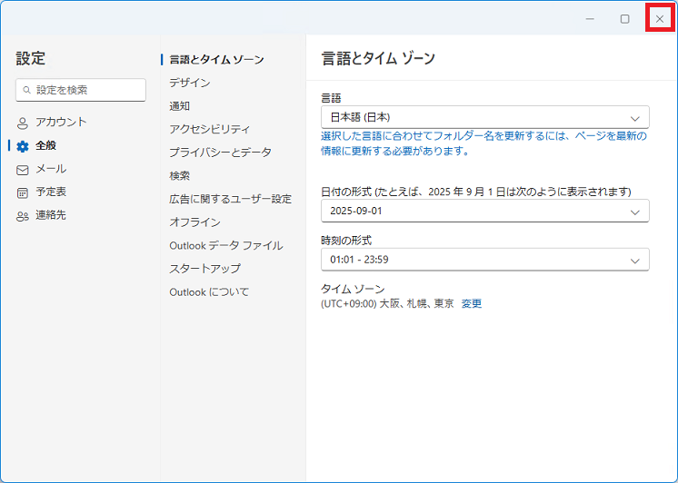 設定画面が日本語表記に変更されたことを確認し、右上の「×」をクリックします。