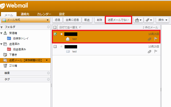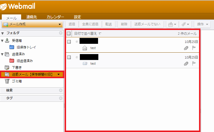 2. 左側の「迷惑メール【保存期間60日】」フォルダをクリックすると、