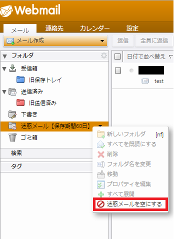 「迷惑メール【保存期間60日】」フォルダ内のメールを全て削除したい場合は、