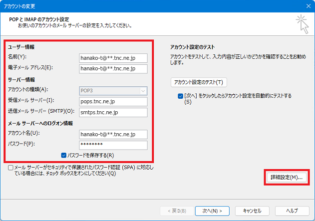 5. メール設定の情報を確認し、必要に応じて修正し、「詳細設定」ボタンをクリックします。