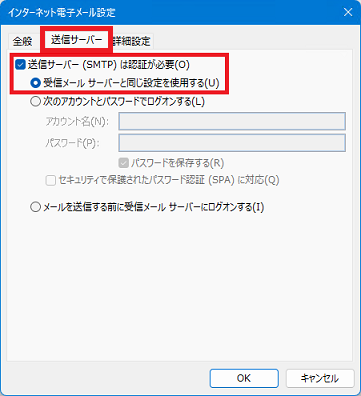 6. 「送信サーバー」タブをクリックし、設定が正しいか確認します。