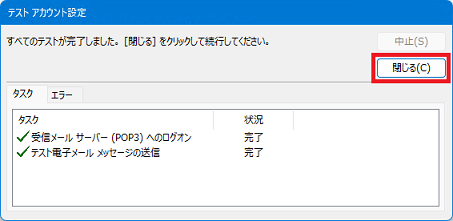 9. テストが完了したことを確認し「閉じる」ボタンをクリックします。